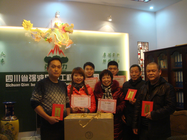 在2011年里,我公司員工團結(jié)一心,積極進取,始終堅持“孝忠義做人,老實人做事”的理念,為公司躍上新的高度而拼搏奮斗。 在這一年里,公司涌現(xiàn)出一批“孝忠義做人,老實人做事”的典型。為激勵廣大員工爭先創(chuàng)優(yōu),公司通過民主的選舉評議后,決定對蒲禮成、官成興、潘國禮、羅娟、孫泉、劉雨、周磊7人授予“優(yōu)秀員工”稱號并給予物品獎勵。希望公司全體員工以此為榜樣,在2012年的工作中再接再厲,不怕艱難,繼續(xù)奮斗,發(fā)揚強波精神!
